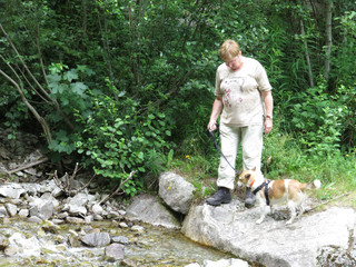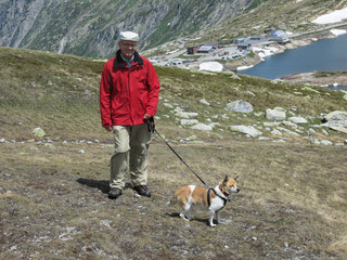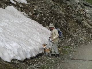 Wir gehen hier viel spazieren und sehen uns die Gegend an. Merkwürdig, die Leute hier bauen hier ihre Häuser oder Scheunen oft auf so komische Ständer und es ist sehr bergig, gar nicht so nass, wie im letzten Urlaub. Aber es gibt einige rauschende Bäche, die auch nass sind. Das Wasser ist aber nicht so salzig, deshalb kann ich es sogar trinken. Ich suche immer Beute, egal wo ich bin. Aber hier kann man an der Leine wirklich nichts fangen. Manchmal sind wir auch mit einer geschlossenen Seilbahn auf die Berge gefahren. Das war mir ganz unheimlich. Mit vielen Menschen in einem wackligen Kasten. Manchmal war es auch noch laut. Ich war immer froh, wenn wir aussteigen konnten. Nur leider hat mich Frauchen dann so kurz an der Leine geführt, dass ich niemand in die Wade zwicken konnte. Das hätte aber mir gefallen. Auf den Bergen waren dann die Leute meist auf mehrere Wege verteilt, dass ich mich wieder wohlfühlen konnte. Hier habe ich selbstverständlich auch ständig nach Beute Ausschau gehalten, man muß ja was zu essen haben, aber ich konnte nichts fangen. Frauchen hatte zum Glück vorgesorgt und mir Futter mitgenommen. So musste ich wenigstens nicht hungern. Manchmal haben wir mitten im Sommer Schnee gefunden. Da wühle und tobe ich, so gut es eben ging. Der Schnee war hart und glatt, aber wir haben das Beste daraus gemacht. Unser Auto wurde in der Schweiz repariert. So konnten wir viele Ausflüge per Auto machen und auch wieder gut nach Hause fahren.