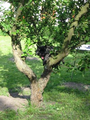 Schon mit 4 Monaten kam ich auf die Idee, doch einmal zu sehen, wie die Gegend oben von unserem Apfelbaum aus aussieht. Leider war ich damals aber noch so klein, dass ich nur mit meinen Vorderbeinen auf den untersten Zweig kam. Also von Aussicht war da noch keine Rede. Aber jeder Welpe wird ja auch mal größer.